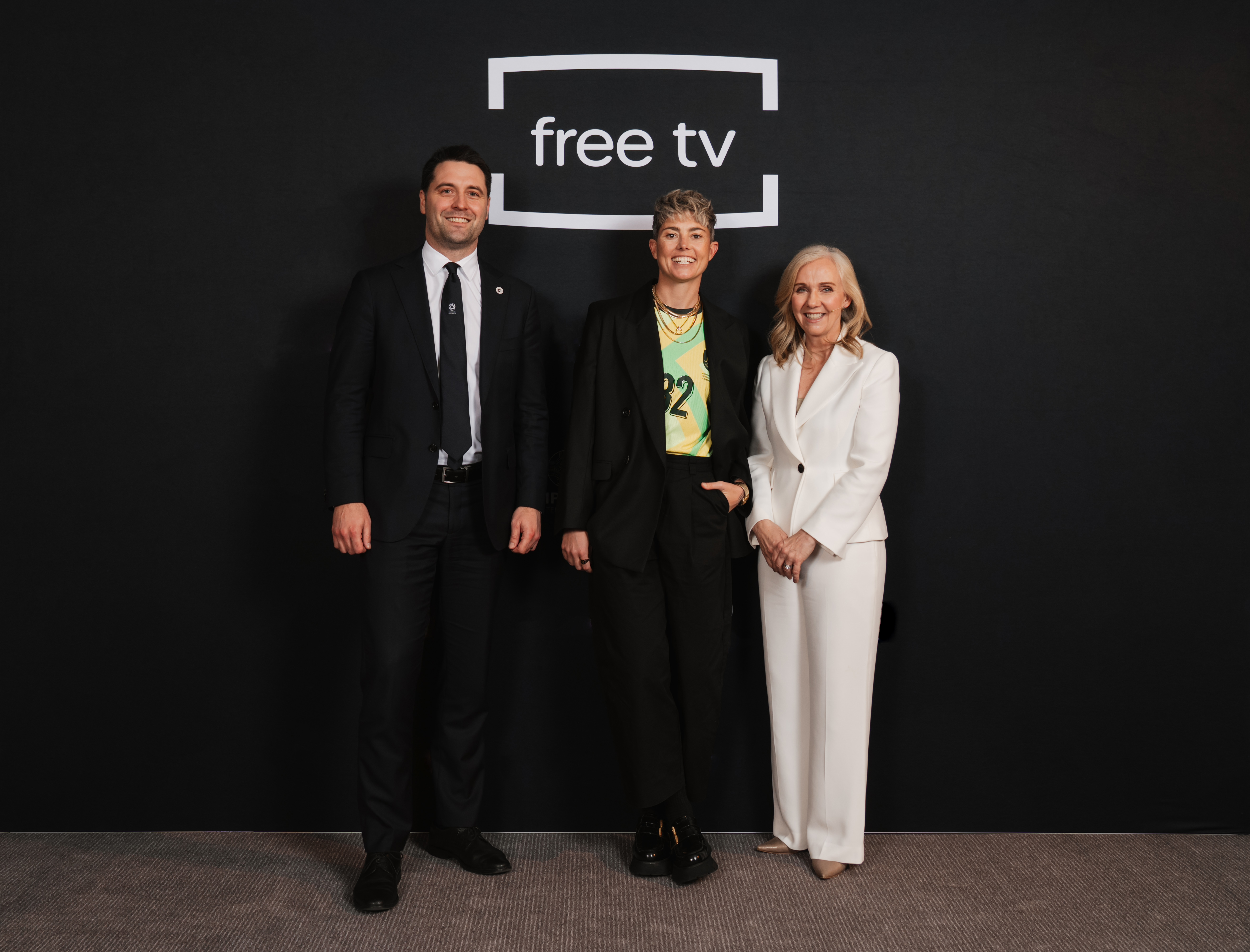 Football Australia and PacificAus TV extend partnership. Pictured: Tom Rishbieth, Chief Revenue Officer Football Australia, Michelle Heyman, CommBank Matildas Player & Bridget Fair, Chief Executive Officer Free TV Australia.