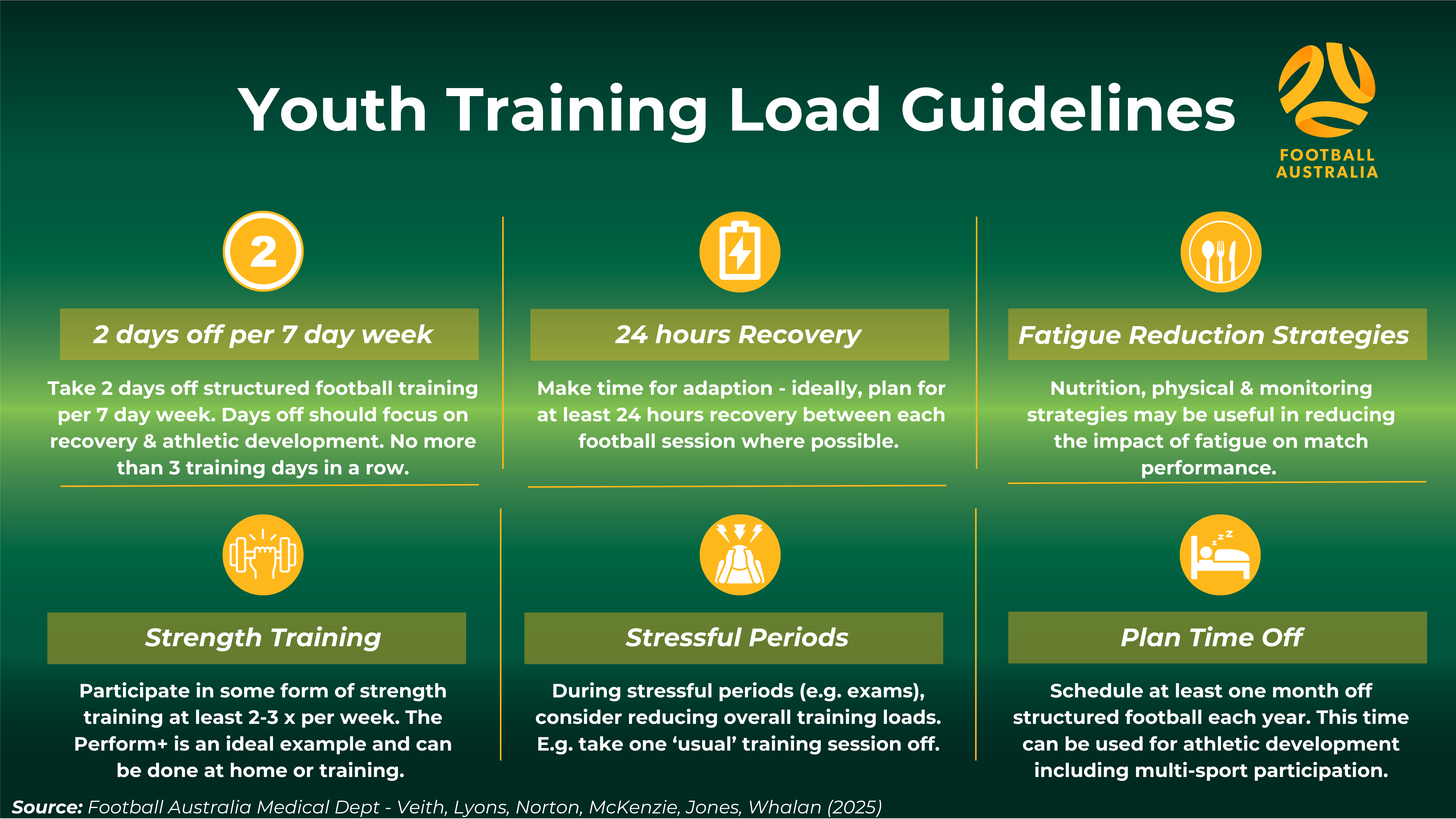 It is now common that talented football players train with multiple separate groups, for example: national teams, NTC / club, TSP, school, private academies, and so on. Each group may focus on a specific area or aim relating to football; however, communication and alignment of training content can be challenging. This may impact on optimal physical and mental loading over a day, week, month, or season / year. Additionally, the impact on growth and maturation of under-17-year-olds may affect the capacity of and recovery from playing or training at times (again both physically and mentally) and may affect each player differently. Over the recent years, we have observed challenges regarding players’ “readiness”, including an increase in load-related injuries impacting player availability for international games. Therefore, the guidelines and information in this document were formulated as recommendations to support player development, performance and health.